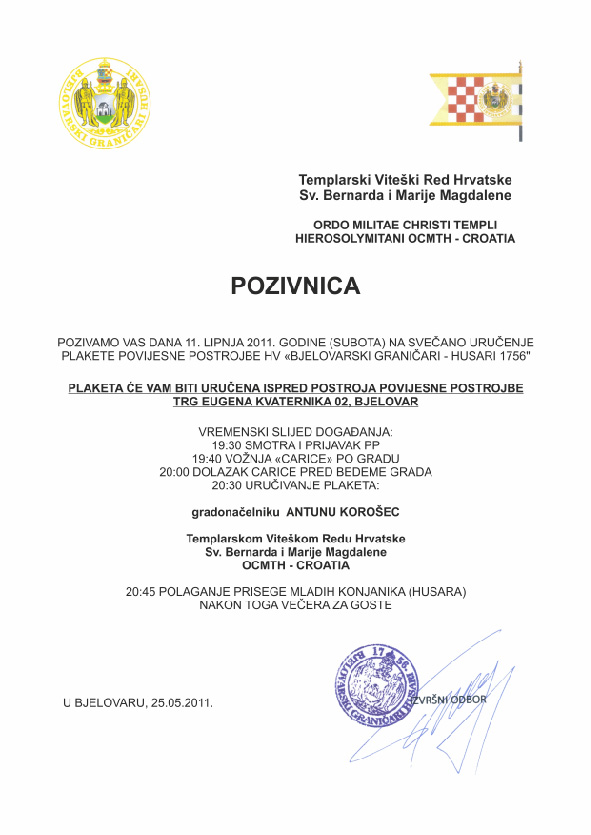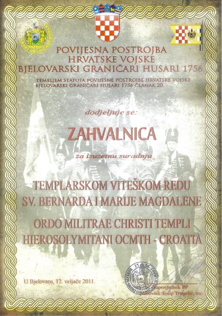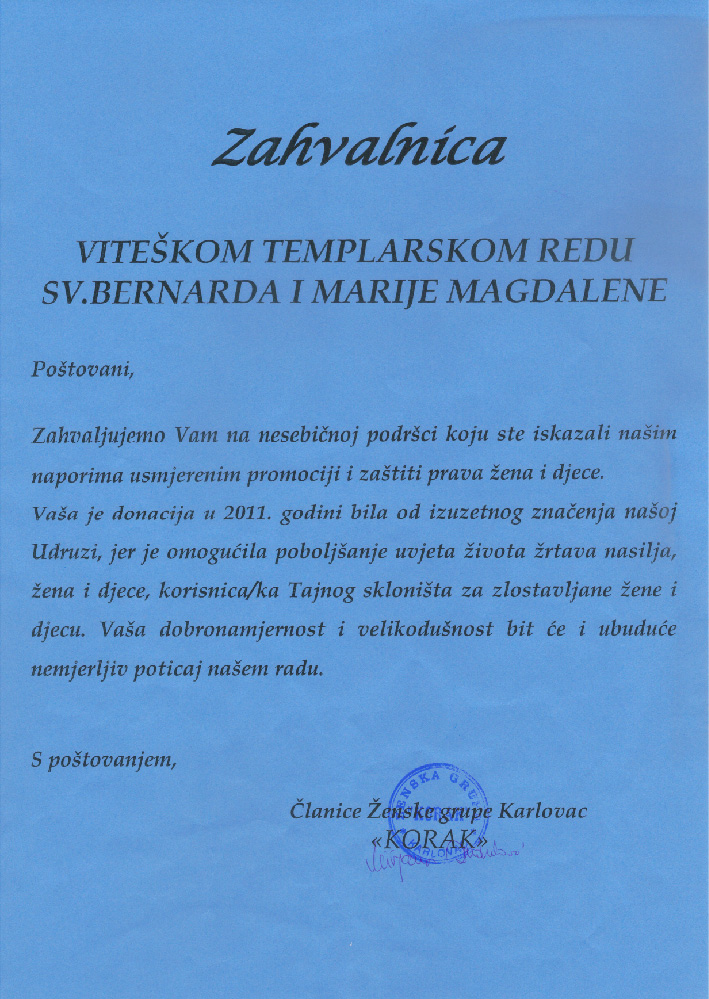U 2011. godini Templarski viteški red Sv. Bernarda i Marije Magdalene sa humanitarnim odjelom UDVDR RH sudjelovao u projektu „Djeca hrvatskih branitelja ulici NE a sportskim klubovima DA“, „Sportskim uspjesima vraćamo dug našim očevima koji su stvorili Lijepu Našu“. Svojom skromnom donacijom opremili smo športski klub u Vojniću i tako pomogli djeci s područja od posebne državne skrbi. |