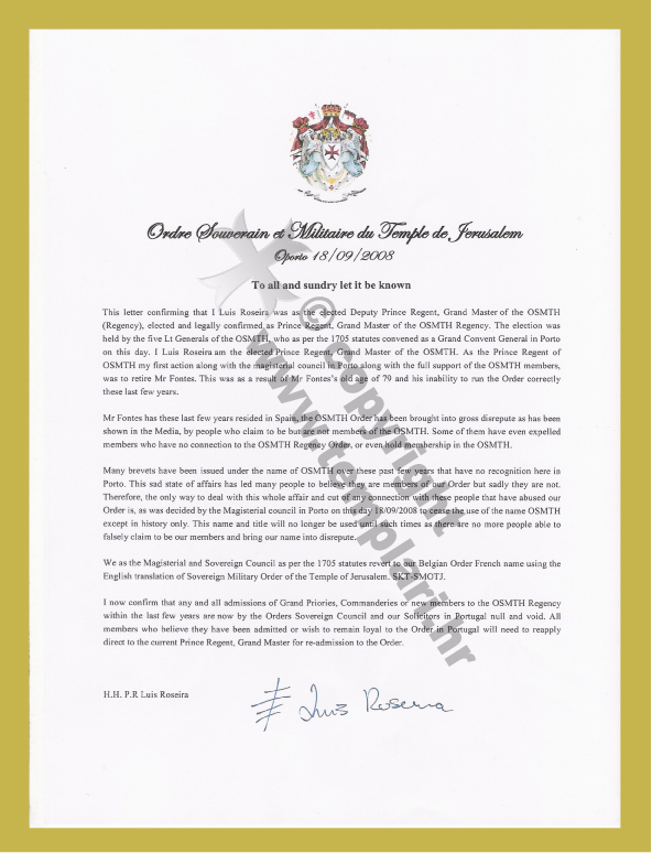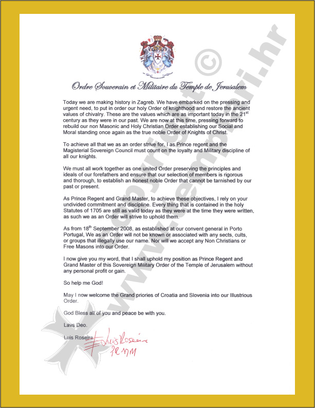 Pismo predsjednika Svjetske Templarske organizacije